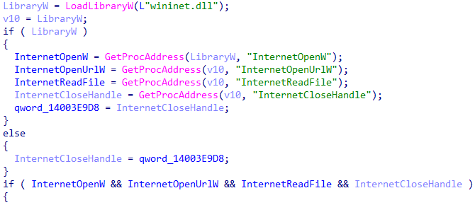 Далее динамически загружает библиотеку API Windows wininet.dll и через функцию GetProcAddress получает адреса API-функций InternetOpenW, InternetOpenUrlW, InternetReadFile и InternetCloseHandle.