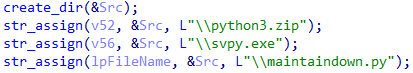 На следующем шаге выполняется попытка создания директории для размещения полезной нагрузки из загружаемого архива python3.zip, а также инициализация ключевых строк \\python3[.]zip, \\svpy[.]exe и \\maintaindown[.]py для подготовки полезной нагрузки к запуску после извлечения.