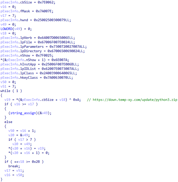 В режиме реального времени Trojan.DownLoader48.54600 расшифровывает адрес для загрузки архива: hxxps[:]//down[.]temp-xy[.]com/update/python3[.]zip. Для расшифровки используется самодельный XOR с константой 0xA.