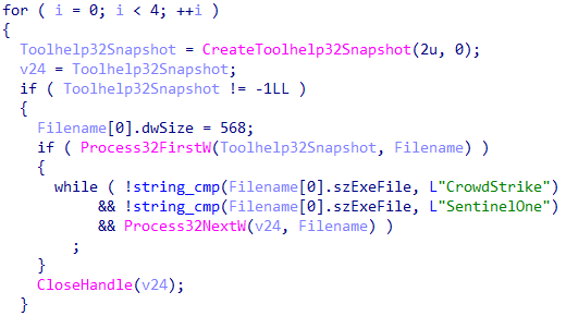 Троян предпринимает 4 попытки загрузить целевой файл, при этом каждый раз он с неустановленной целью пытается найти процессы приложений CrowdStrike и SentinelOne.