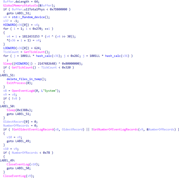 Непосредственно перед загрузкой файла Trojan.DownLoader48.54600 пытается определить, запущен ли он в искусственной среде. Для этого он проверяет наличие нужного объема оперативной памяти (должно быть не менее 2 ГБ), измеряет время выполнения функции Sleep, пытаясь обнаружить ускорения, характерные для отладочных сред, а также проверяет количество записей в системном журнале событий (должно быть не менее 120). Если троян обнаруживает один из признаков отладочной среды, он удаляет все файлы в каталоге %TEMP% и завершает работу.