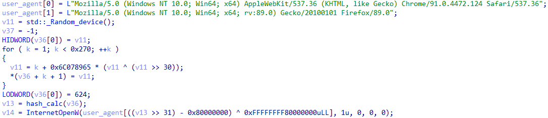 Если антиотладочная проверка проходит успешно, Trojan.DownLoader48.54600 на основе класса Random_device и нестандартного хеширования случайным образом выбирает один из двух возможных user-agent: Mozilla/5.0 (Windows NT 10.0; Win64; x64) AppleWebKit/537.36 (KHTML, like Gecko) Chrome/91.0.4472.124 Safari/537.36 или Mozilla/5.0 (Windows NT 10.0; Win64; x64; rv:89.0) Gecko/20100101 Firefox/89.0.