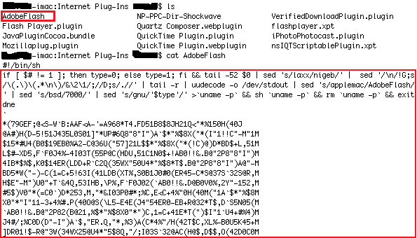 Загруженный сценарий устанавливается в системную директорию /Library/Internet Plug-Ins/AdobeFalsh, пытаясь замаскироваться под программы от компании Adobe.